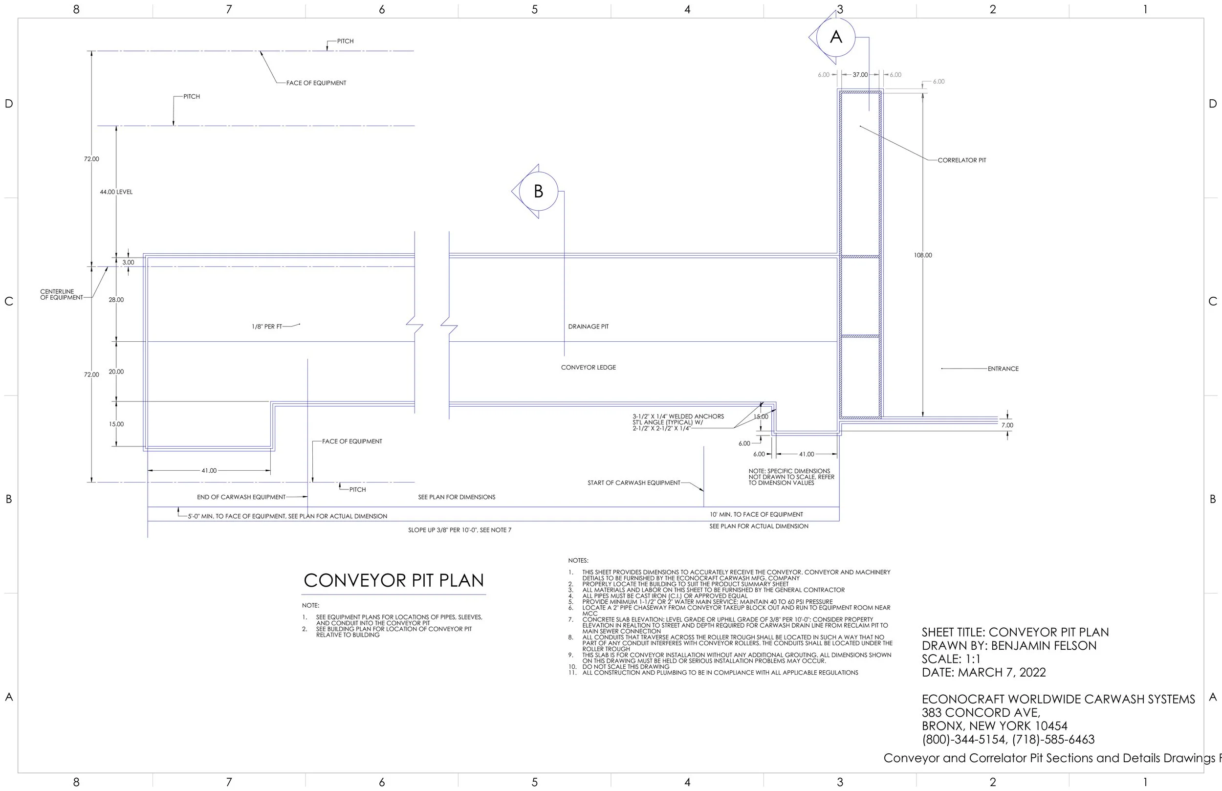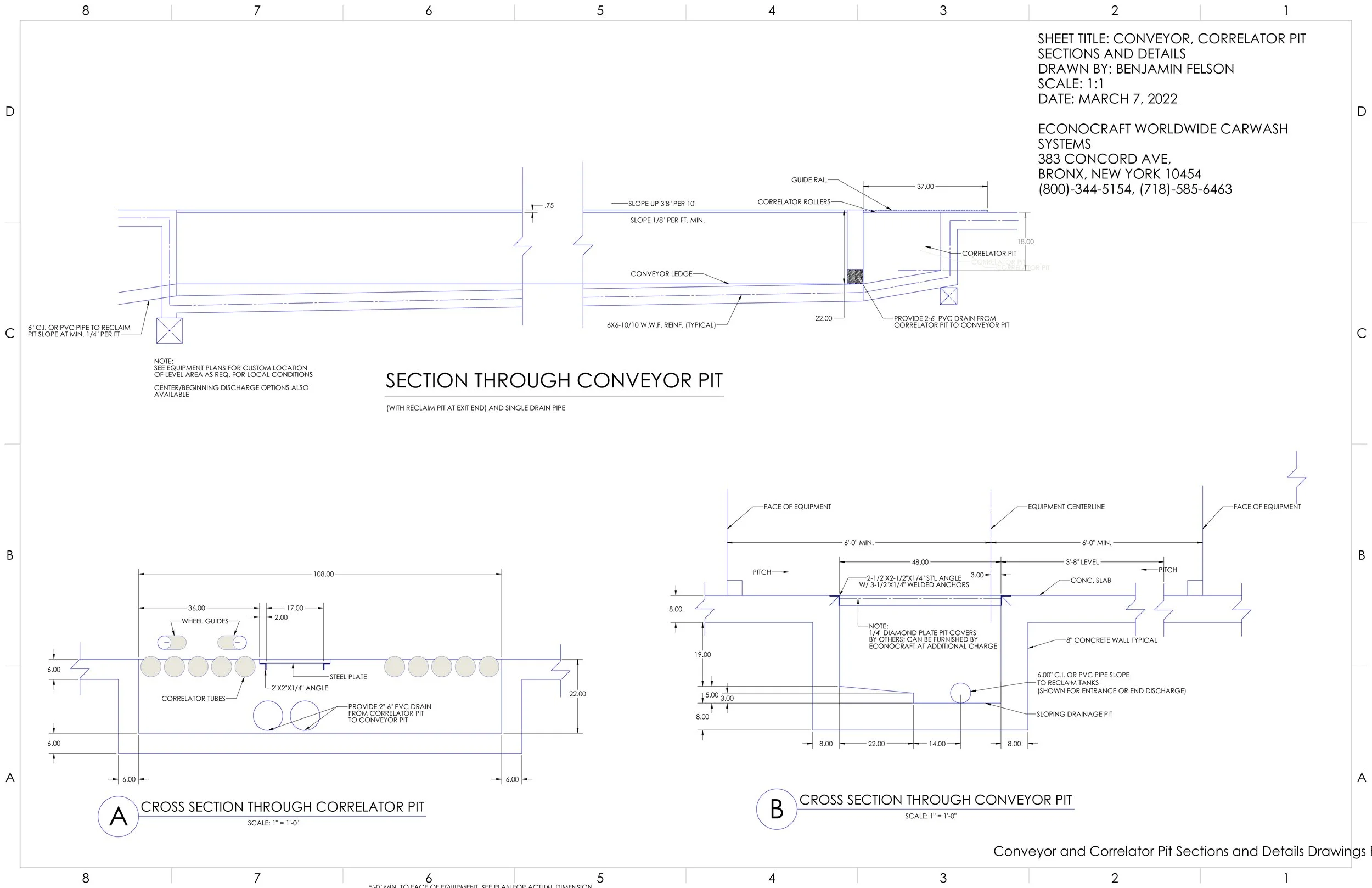 I was commissioned by a national car wash equipment manufacturing company to create construction plans to modify the conveyor and correlator pit for a car wash in Yonkers whose design was flawed. Originally, the grading of the conveyor pit was not sufficiently transporting runoff water to the reclaim pit. Additionally, I was tasked with finding a solution to the fact that the vehicle transportation belt was not aligned with the geometric centerline of the car wash, meaning that the design of the exit of the car wash had to be significantly modified.
